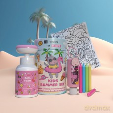 HISKIN Kids Zestaw na wakacje tubie pianka do mycia, żel pod prysznic, w prezencie kolorowe kredki oraz kolorowanki - niebieski