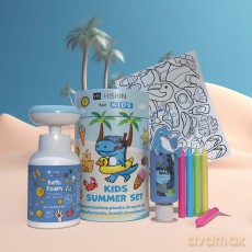 HISKIN Kids Zestaw na wakacje tubie pianka do mycia, żel pod prysznic, w prezencie kolorowe kredki oraz kolorowanki - niebieski